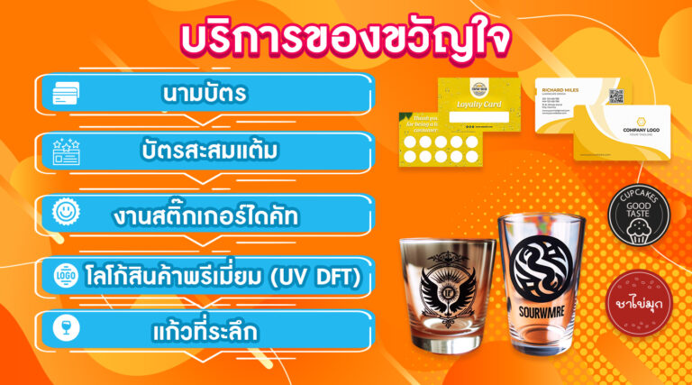 นามบัตร บัตรสะสมแต้ม สติ๊กเกอร์ไดคัท งานพรีเมี่ยม ของชำร่วย นึกถึงขวัญใจมหาชน พร้อมให้บริการ